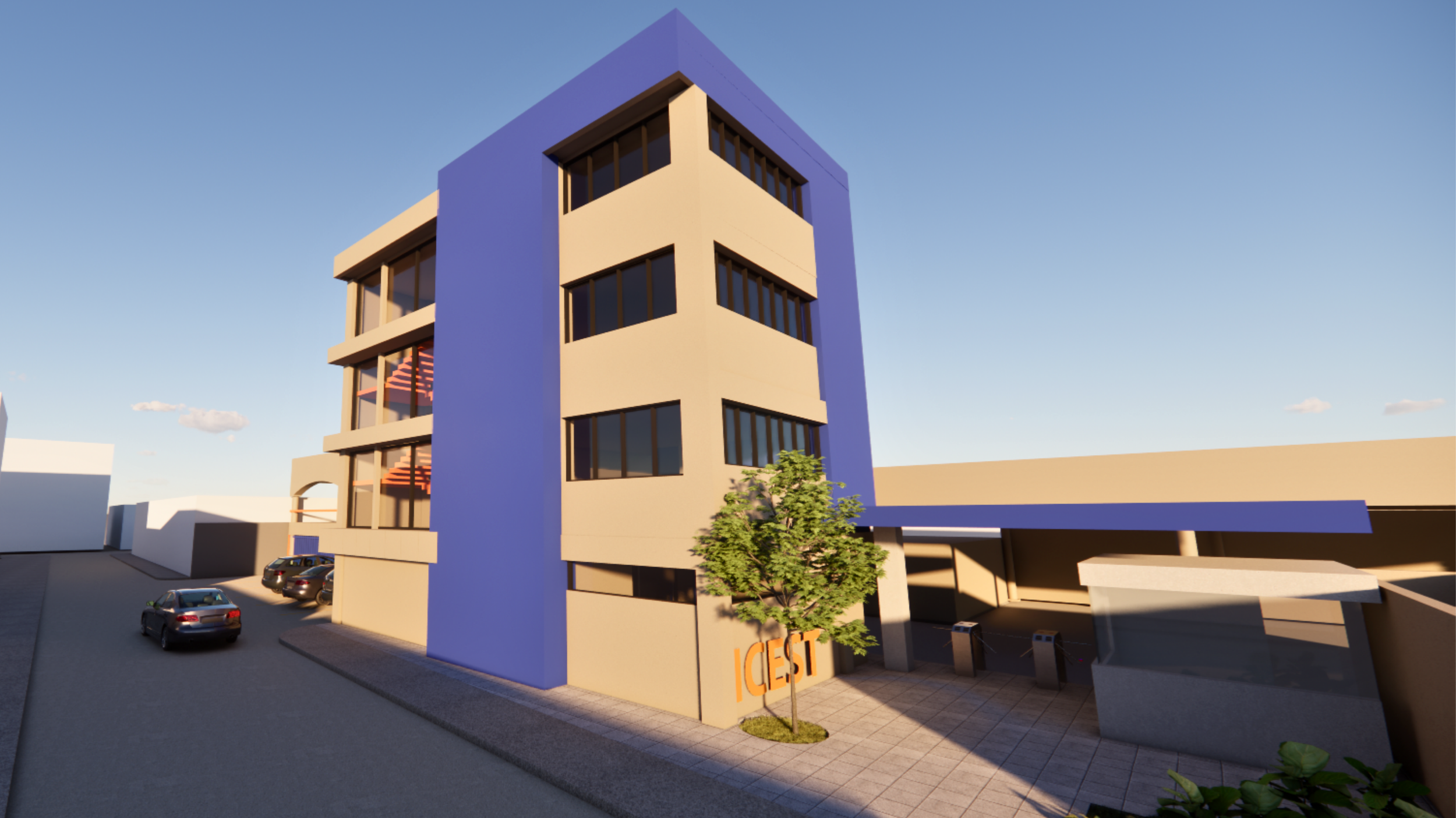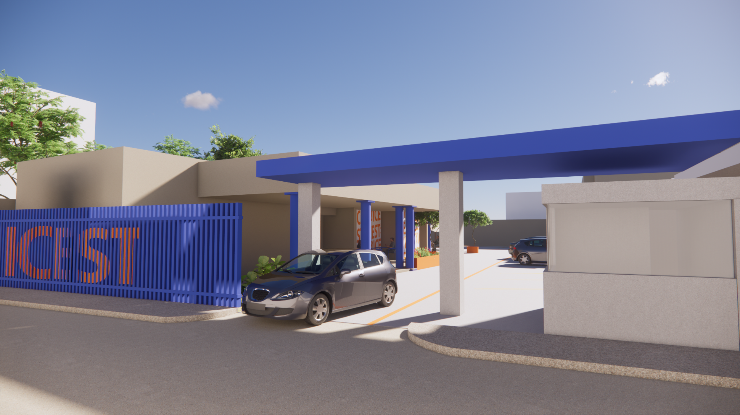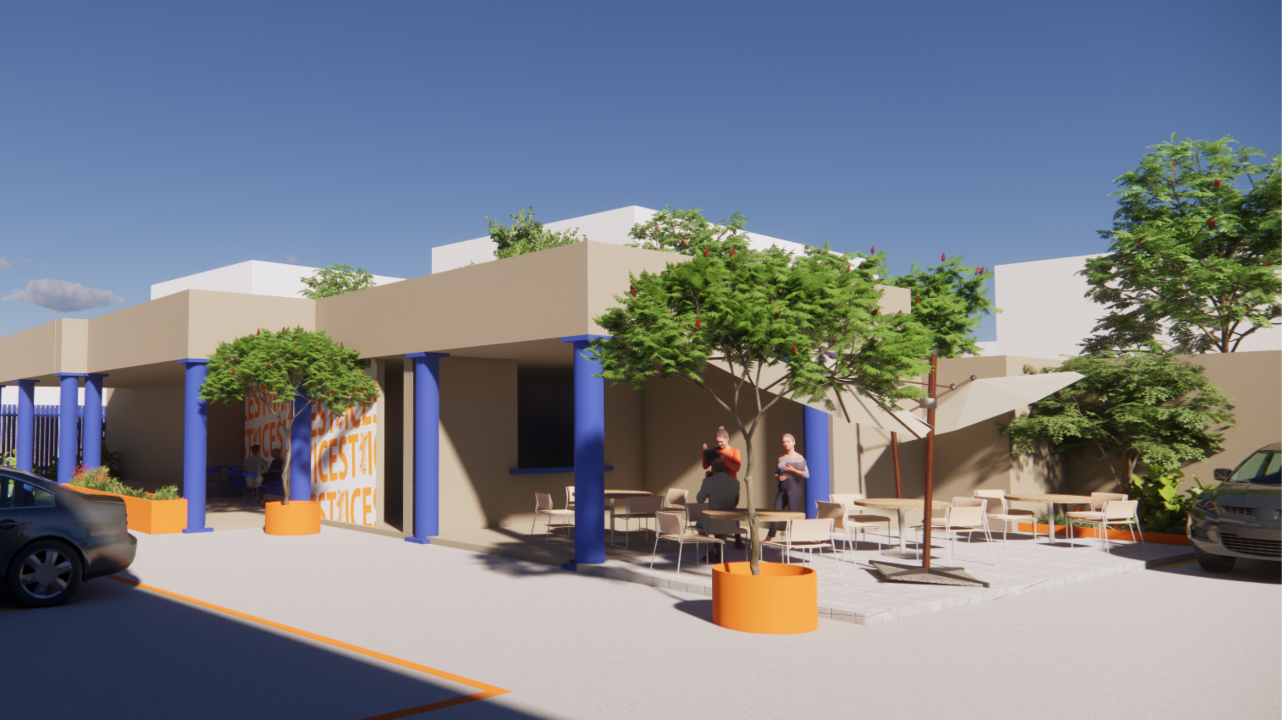 Las imponentes columnas en azul y las jardineras en naranja vibrante no son solo soportes estructurales; son faros de pertenencia. La nueva terraza exterior invita a la permanencia, creando un lounge académico donde las ideas fluyen mejor bajo la sombra de los árboles y la comodidad de un mobiliario contemporáneo.ARQUITECTURA