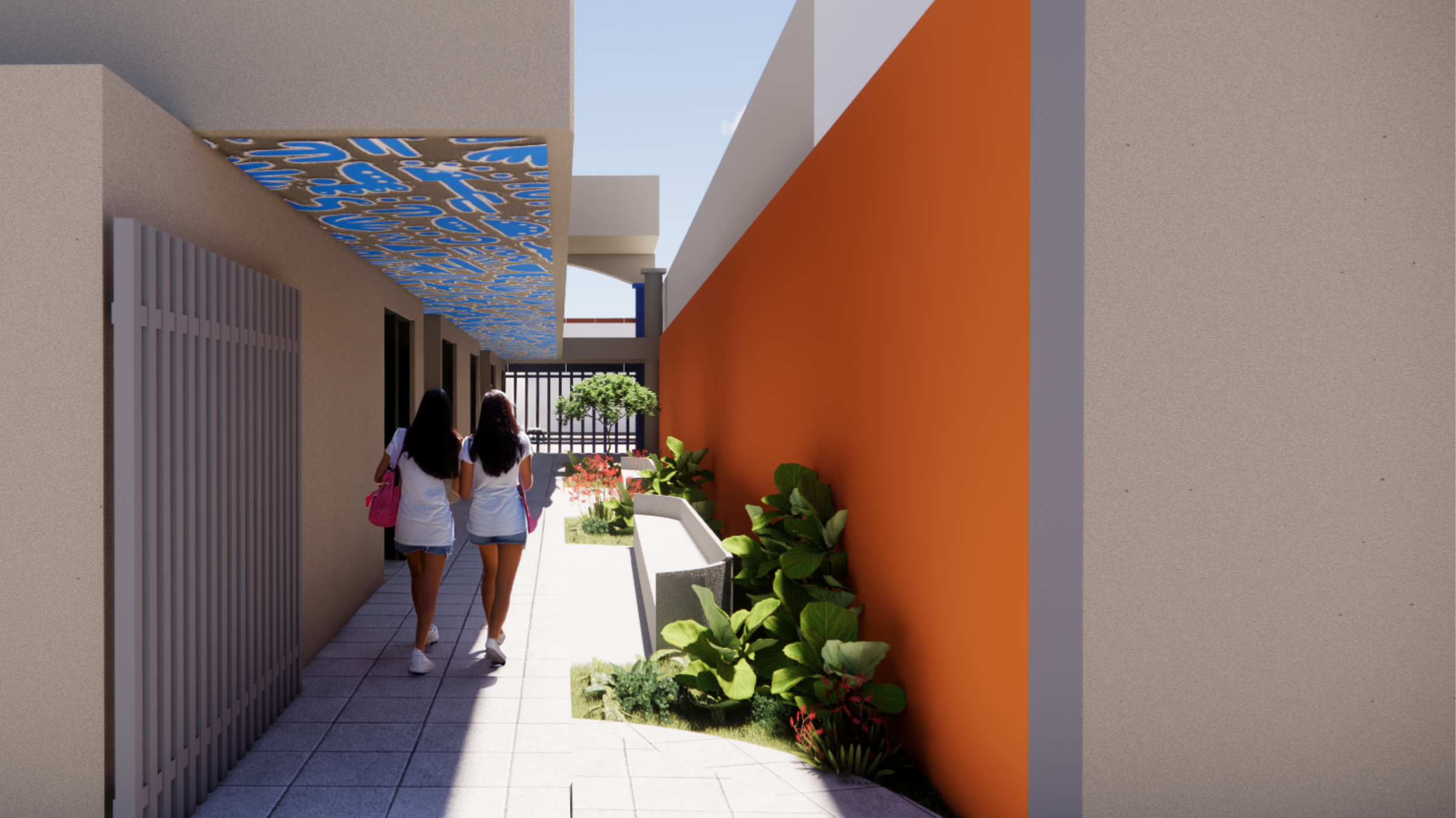 emblemaSRompemos la monotonía del tránsito diario con una intervención vegetal y artística en los corredores. Las superficies duras ceden espacio a la biofilia, introduciendo vegetación que suaviza la temperatura y el ambiente visual. Al fondo, los murales tipográficos actúan como lienzos urbanos que refuerzan el orgullo institucional, convirtiendo un simple pasillo en una galería abierta que inspira creatividad en cada cruce.